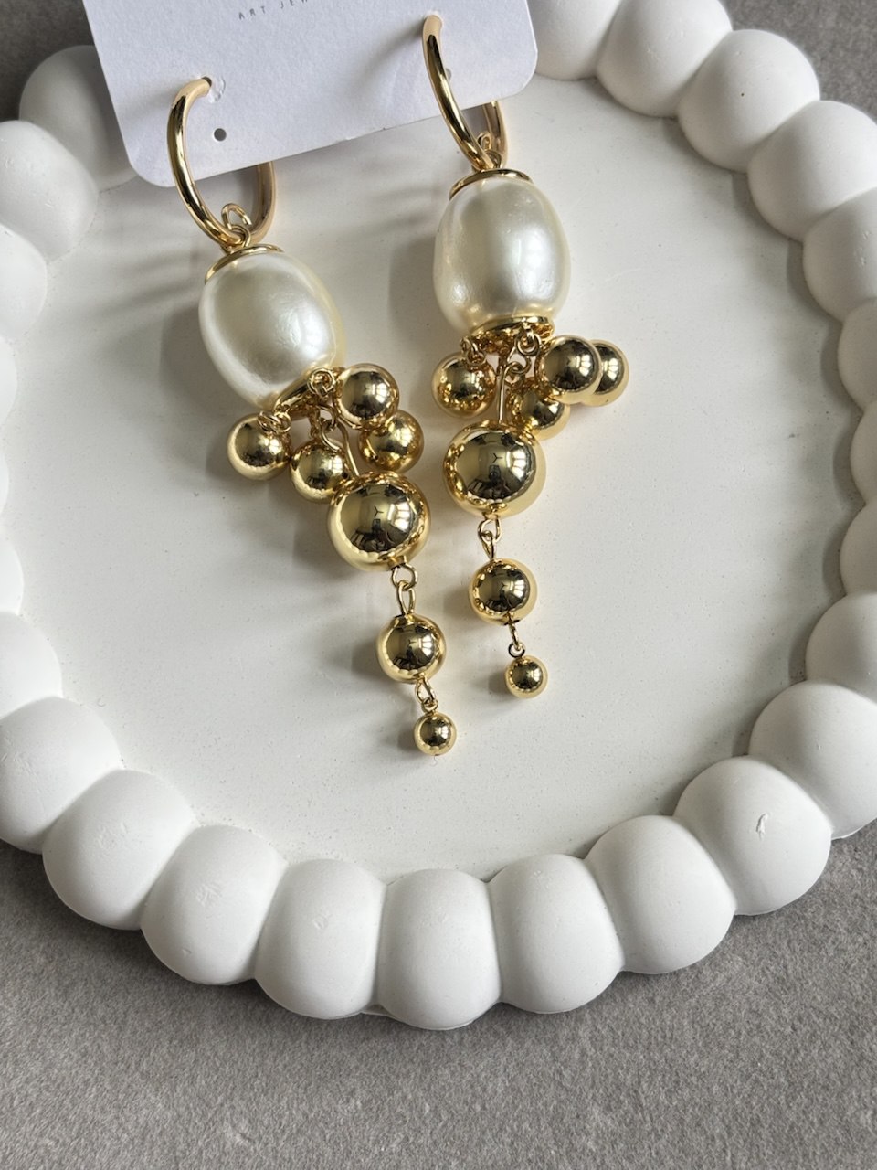 Elevate your look with these stunning statement earrings that blend classic elegance with modern flair. Each earring features a lustrous oversized baroque pearl suspended from a gold-tone huggie hoop, flowing into a cascading cluster of polished gold spheres in varying sizes. The multi-ball drop design adds movement and dimension, making them perfect for both special occasions and elevated everyday wear.